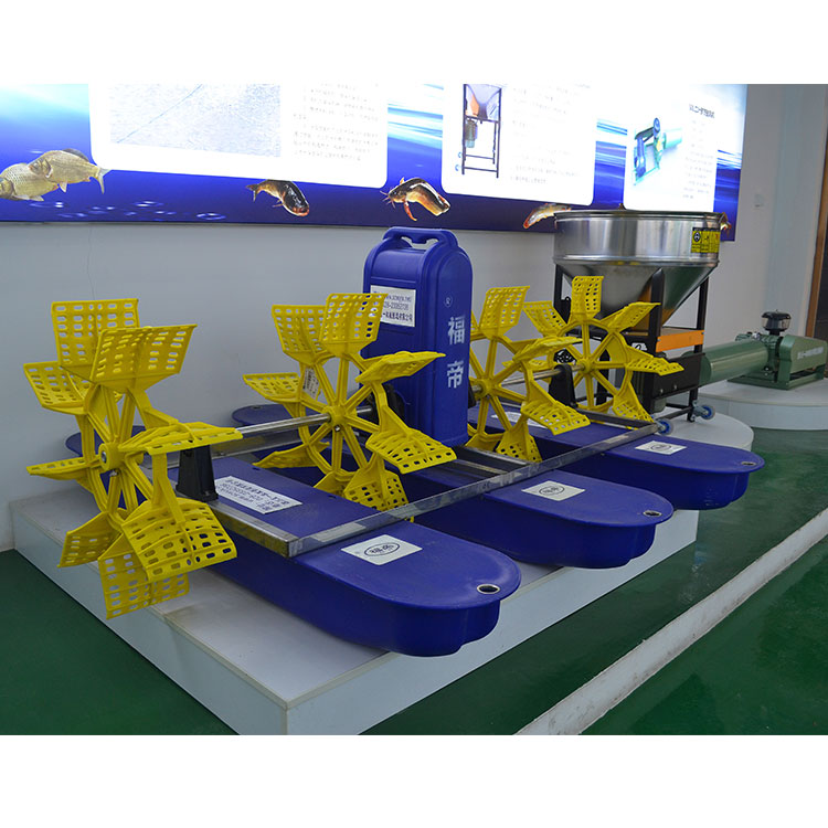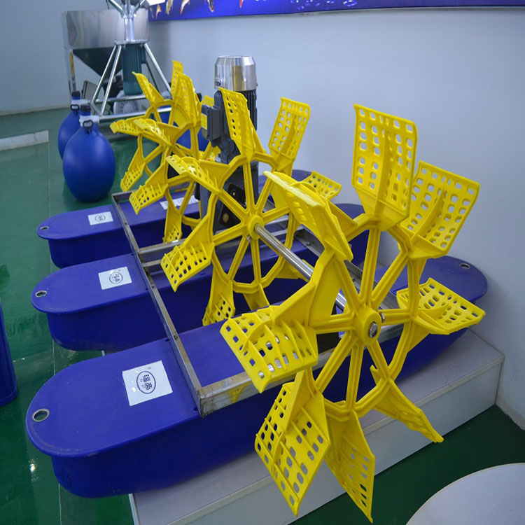 6、水车增氧机产出的水花和空'接触达到增氧,流出的水把整个鱼塘里的水推动施转从而把有毒物质、有害物质、施转到中心,让吃水深度深的设备把有害物质分减。