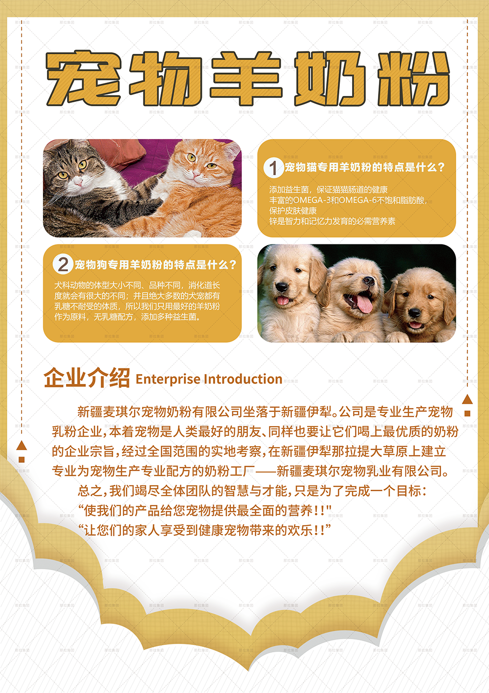 新疆麦琪尔宠物乳业有限公司专业生产、研发、销售、设计宠物奶粉,定制高端宠物奶粉,自有牧场5.1万亩,奶源地建厂,保证了鲜奶到场运输不变质,保证了奶源的新鲜。厂家面向全国招宠物奶粉代理商、经销商,承接宠物奶粉OEM代加工服务,从商标注册到成品出货一条龙服务,资质齐全。