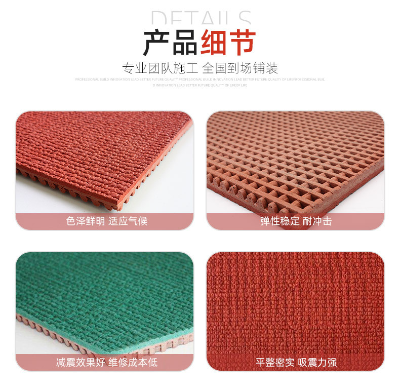 2、弹性适宜、安全性高、反作用力佳、防滑性能好、地面反光度极低。