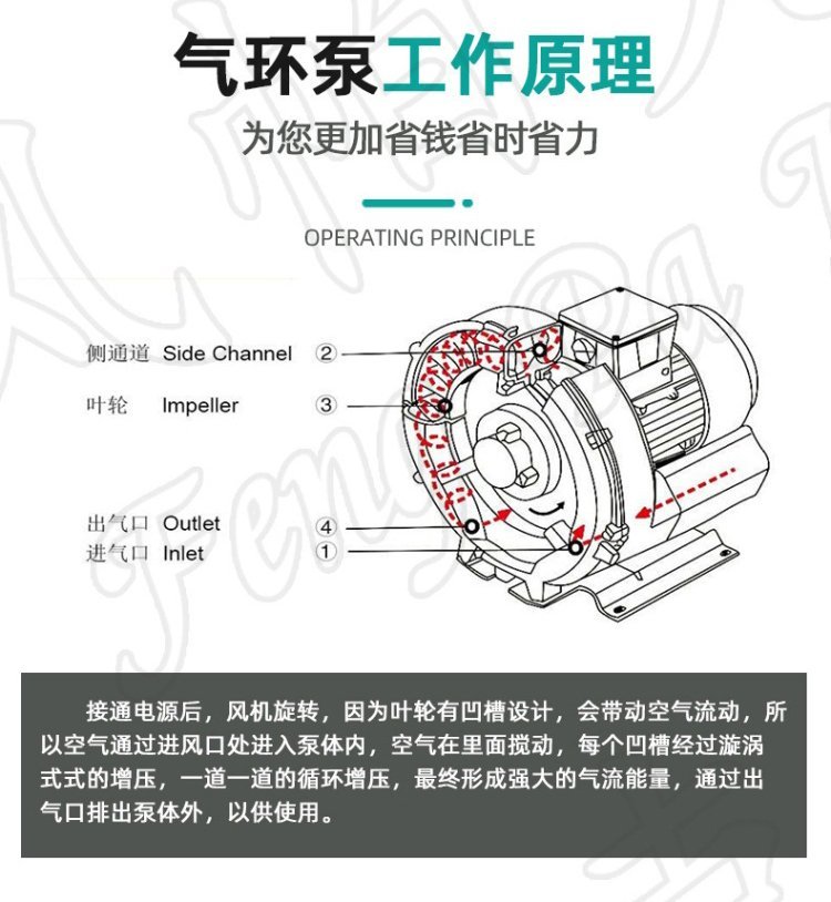 工作原理 | 通过叶轮凹槽设计带动空气流动,循环增压形成强大气流 | ||
