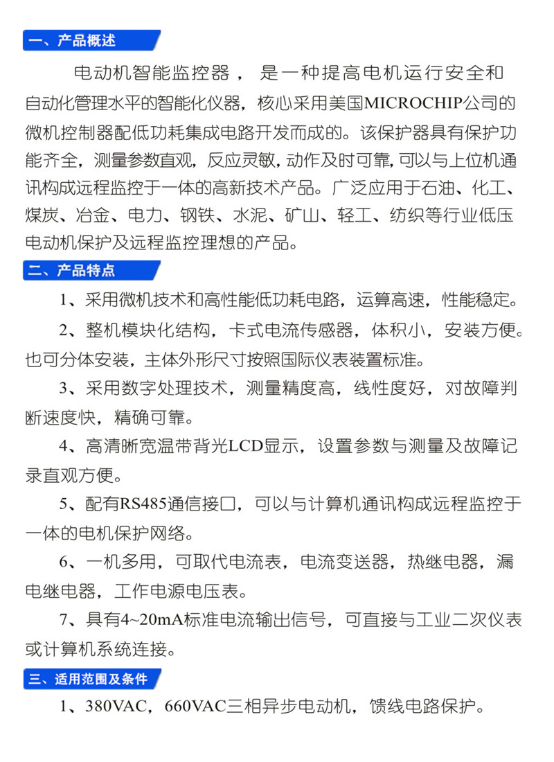 KMB-Y电动机智能监控器为电机提供的完备保护,避免了因电机过载、轻载、堵转、欠压、启动超时、断相、三项不平衡、接地、晃电等可能故障导致的生产故障,最大限度地保证设备运行的有效性与安全性。