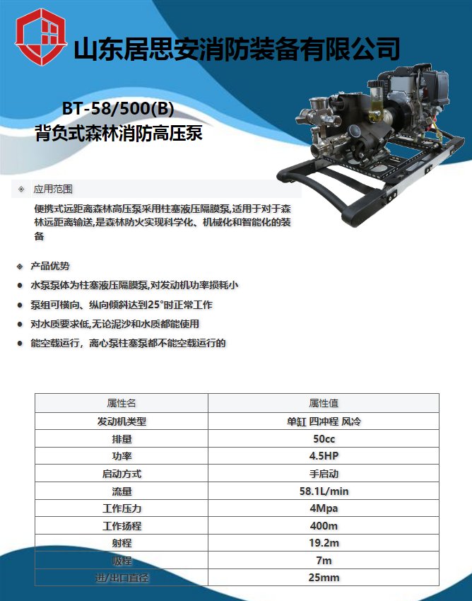居思安BT-58/500(B)森林消防高压泵减震设计背负式并联泵 品牌居思安消防