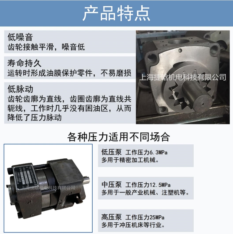 ???? 直线共轭内啮合齿轮泵是一种设计新颖,能在高压、高速、大功率工作条件下低噪声工作的液压动力源。现已在工程机械、自动化设备、锻压、叉车、注塑机、船舶、压砖机、弯管机、折弯、剪板机床等领域使用。