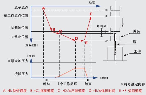 三、、压装过程:整个压装过程分为快进、探测、压装、保压、返回五个阶段。开机时机器会自动寻找机械原点,设置好参数后,按启动按钮压头将在此位置以快进速度下降到探测位置,然后以探测速度下降,开始探测过程。探测过程直到所设定的探测限制位置为止,如到了探测限制位置还未探测到工件,压头将停止动作,此时可按回零按钮返回机械原点;当在探测过程接触压力达到设定值时,压头自动切换到压装速度开始压装工件。压装到设定位置时将按用户所设定的保压时间保压,保压时间结束后压头以设定速度返回至所设置的工作原点。