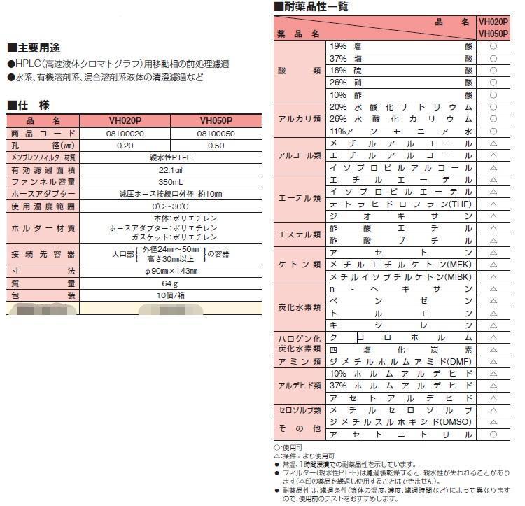 親水性PTFEタイプメンブレンフィルターを用いていますので、水系液体、有機溶剤系液体でのフィルターの使い分けの必要がなく、混合溶剤(水─エチルアルコール/水─アセトニトリルなど)の濾過にも適しています。