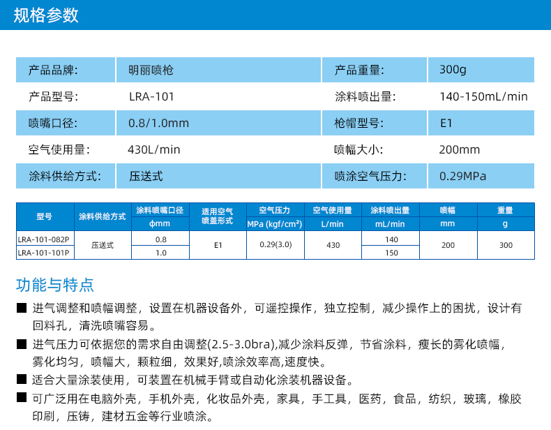 功能用途 | 色漆、橡胶漆、PU漆、UV漆、光油、导电漆、清漆、铁氟龙、水性漆、等涂料喷涂 | ||