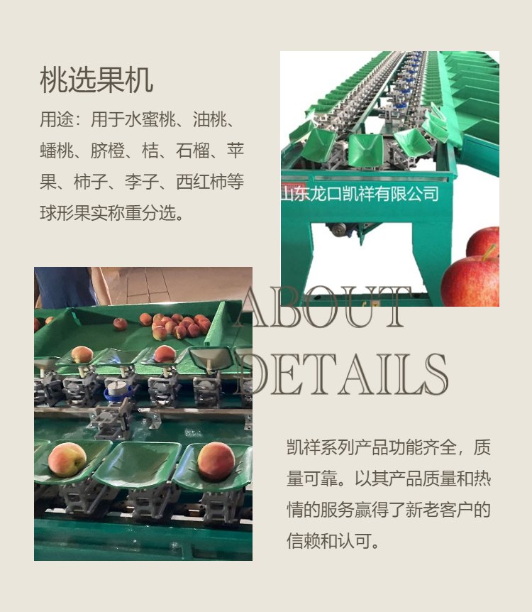 ??山东龙口凯祥有限公司生产的映霜红晚桃分选机,采用天平与杠杆原理,利用盛料器重量与砝码器所设定秤量,以游动时的移位与测量达到选择重量的分等分级。在全自动的传送中,快速正确的对各种需要分级的果蔬称重分选,例如梨、苹果、芒果、桃、柑橘、沙糖桔、桃、西红柿、马铃薯、地瓜、李子、柿子、洋葱等,产生精确的分级。大厂家,产品质量可靠,售后服务周到。