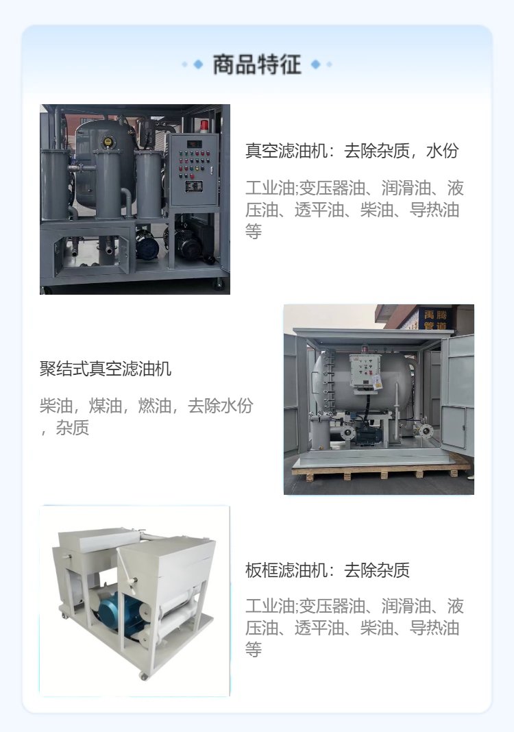 我司主要生产各种型号:真空滤油机,板框滤油机,小推车滤油机,真空抽气机组等工业油品【变压器油、绝缘油、润滑油、液压油、透平油、柴油、导热油等等】净化设备,具有过滤杂质水份、抽油加油、抽真空等功能