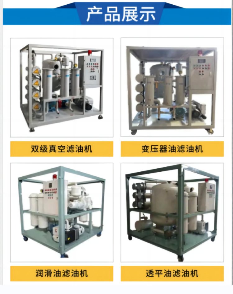 我司主要生产各种型号:真空滤油机,板框滤油机,小推车滤油机,真空抽气机组等工业油品【变压器油、绝缘油、润滑油、液压油、透平油、柴油、导热油等等】净化设备,具有过滤杂质水份、抽油加油、抽真空等功能