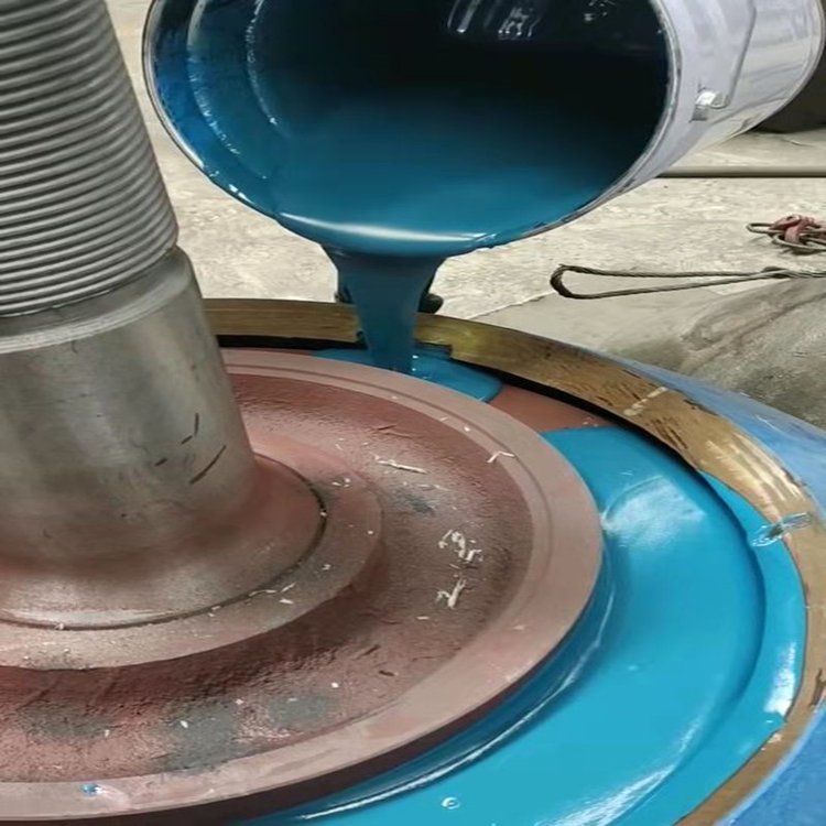 清除锥体表面残余填充料,和与胶接触部位油污,脏物;装合锥体和衬板;用胶带等封住锥体/衬板配合面和环孔,以防漏胶,必要时保护轴上的螺纹;使用时尽量在10℃-30℃施工,冬季施工最好将A组分单独加热到20℃-30℃以降低粘度便于浇注。为便于下次拆卸,锥体和衬板表面可预涂适量机油或脱模剂。夏季温度大于30℃时,应减少一次浇筑量,每次浇筑不大于五桶配胶量,每次浇筑时间间隔不小于40分钟。针对于不同浇筑体积不同温度下的浇筑操作,可做出调整。避免出现一次性浇筑量过大,胶液反应过快放热过多而造成鼓泡,收缩脱离,出现裂缝 b等不良现象的出现。
