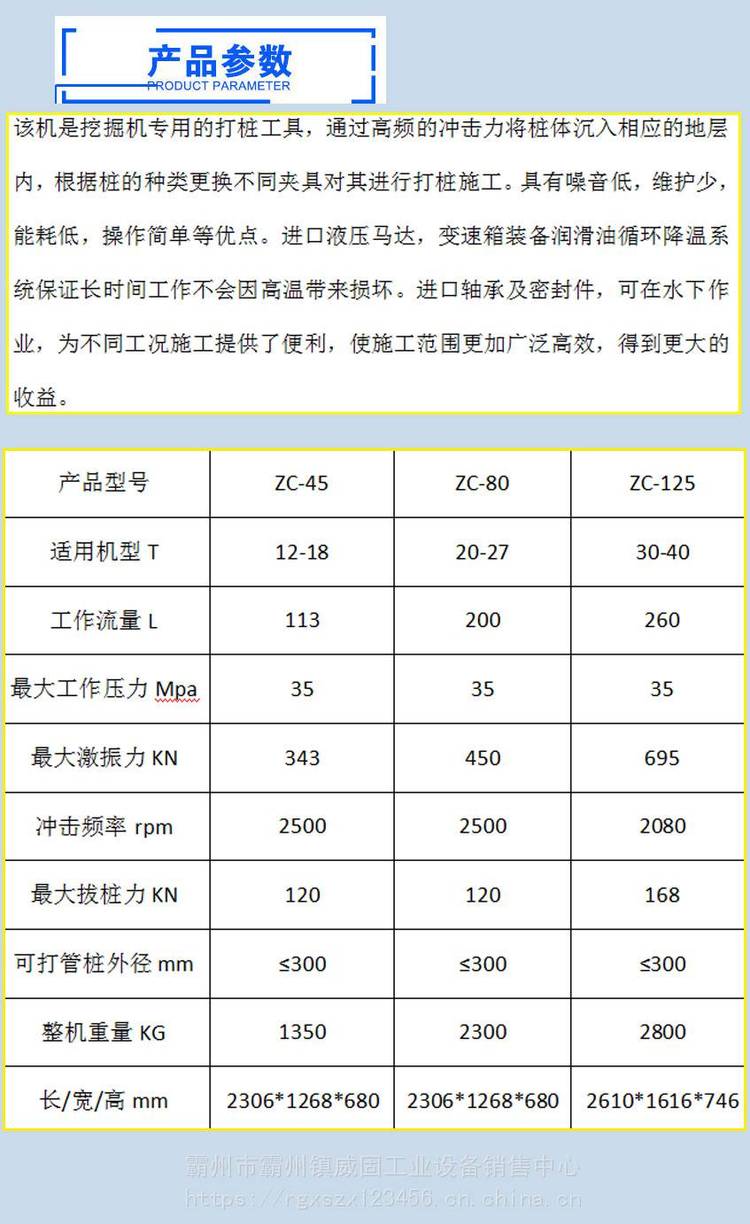 该机是挖掘机的打桩工具,通过高频的冲击力将桩体沉入相应的地层内,根据桩的种类更换不同夹具对其进行打桩施工。具有噪音低,维护少,能耗低,操作简单等优点。进口液压马达,变速箱装备润滑油循环降温系统 长时间工作不会因高温带来损坏。进口轴承及密封件,可在水下作业,为不同工况施工提供了便利,使施工范围更加 ,得到更大的收益。