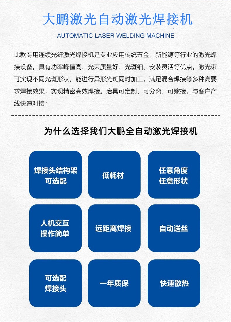 大鹏激光全自动光纤激光焊接机金属不锈钢铝铜大功率电池批量产品