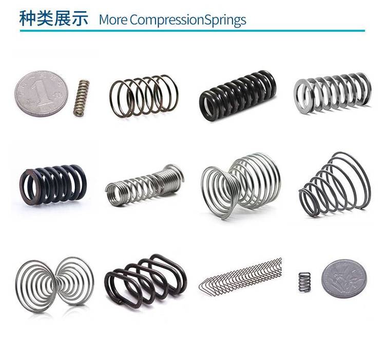 压缩弹簧,是承受向压力的螺旋弹簧,它所用的材料截面多为圆形,也有用矩形和多股钢萦卷制的,弹簧为等节距的,压缩弹簧的形状有:圆柱形、圆锥形、中凸形和中凹形以及少量的非圆形等,压缩弹簧的圈与圈之间有间隙,当受到外载荷时弹簧收缩变形,储存形变能。