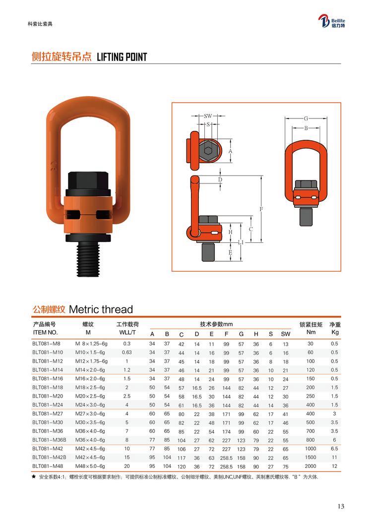 侧拉吊环采用合金钢材质,所有锻造件以及帽螺栓上都印有批次编号,以便于在质量认证书上进行检查核对。起重吊环均可360度全周旋转,且具有180度支点绕轴旋转功能。(表面达克罗处理)增加了产品的抗腐蚀性能。螺栓为统一标准粗牙螺纹,规格为满足ASTM A 574标准的内六角合金角头螺栓。验证载荷为较高工作载荷的2.5倍,以1.5倍极限工作载荷的作用力进行20000次的疲劳极限测试,垂直翻转达到,限定量大角度90度产品全部磁粉探伤检验。
