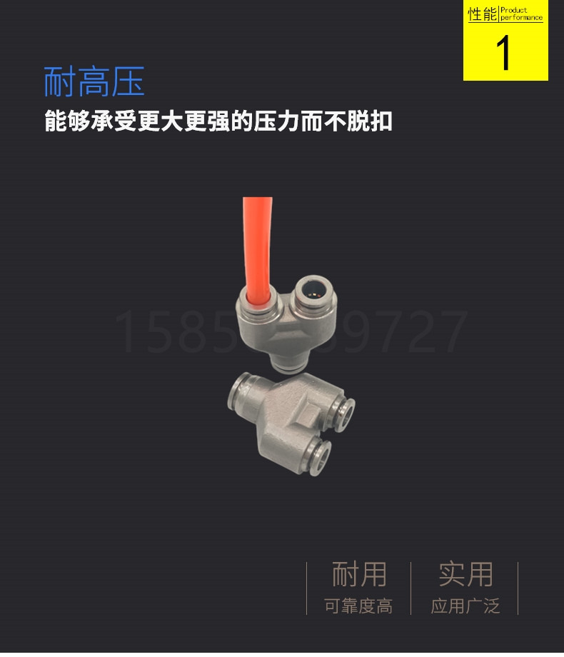 不锈钢Y型快插异径三通接头特点:安装较快,接头拆断和连接油路时,动作简单、不仅节省时间还节省了人力;简单灵巧,占用空间小;型式多样,任何气动布管都可使用;安装以后,塑料管可以随意转向;密封性能好