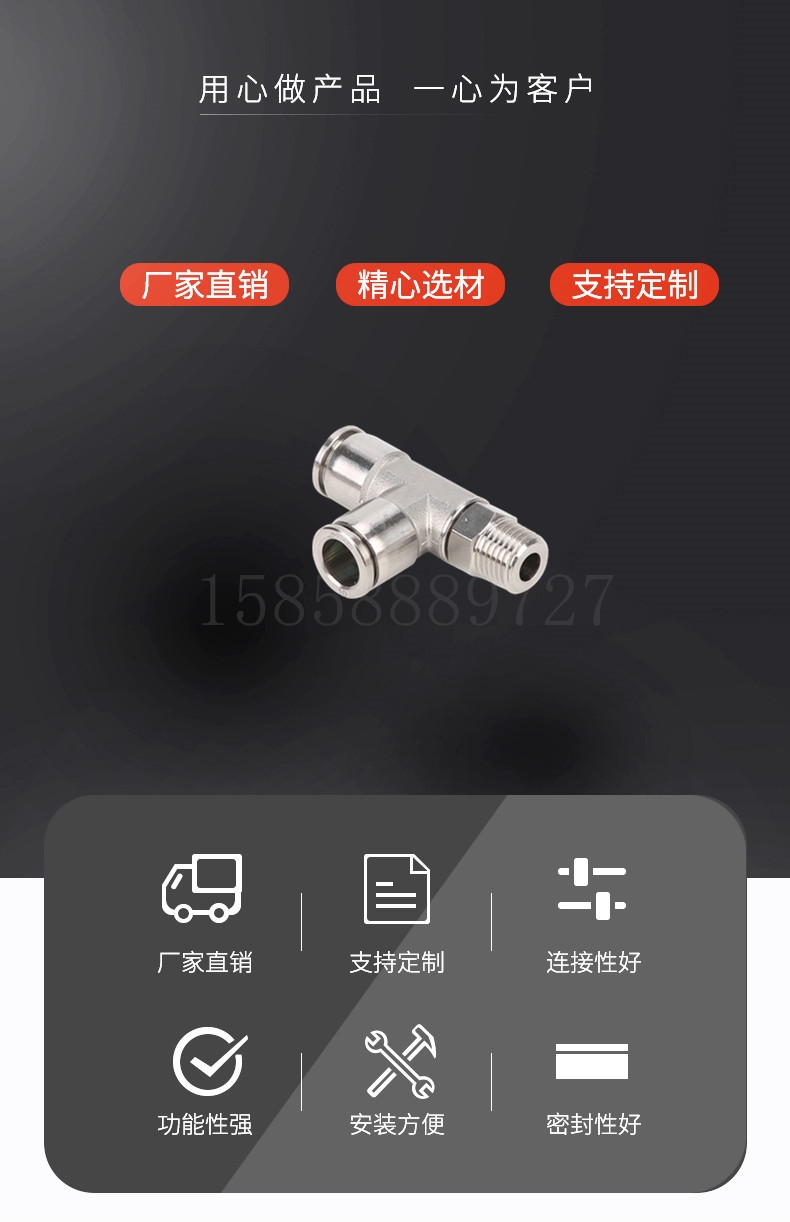 不锈钢快插侧螺纹三通主要特性应用 只需“即插即用” 可靠连接 内附密封轻松选择适用的接头。快插/螺纹接头为每一种连接都提供了牢固的解决方案。便捷的快插/螺纹接头系统包括了超过1000种的标准型和功能接头。接头上的不锈钢夹爪可牢牢固定住气缸而不会伤及气管表面。并可安全吸收振动和气压涌动。按下蓝色的解卸环。出于便利性考虑相对应的气管外径标注于解卸环上。标准气管适合用于压缩空气和真空。快插/螺纹接头所有的铜质部件都经镀镍因此具有非常好的耐腐蚀性。锥形ISO R螺纹带有自密封的PTFE涂层可最多连续使用五次而无需附加的密封元件。可360°重新定位360°可旋转带滚珠轴承在装配时就已校准。使用时能补偿气管移动。最高允许500 rpm的旋转速度。哪个接头配哪个螺纹公制平行螺纹G平行螺纹符合DIN ISO 228-1R锥形螺纹符合DIN 2999-1和ISO 7/1?柱状公制螺纹与G螺纹相当?通过密封圈密封?前端面密封?螺纹短?安装深度恒定?密封圈可替换?前端面密封?由于密封圈可替换故可多次使用?自密封螺纹?通过涂层螺纹密封?无需额外的密封表面?密封圈表面无需槽口。安装尺寸更紧凑?最多可使用五次,而无需附加的密封元件