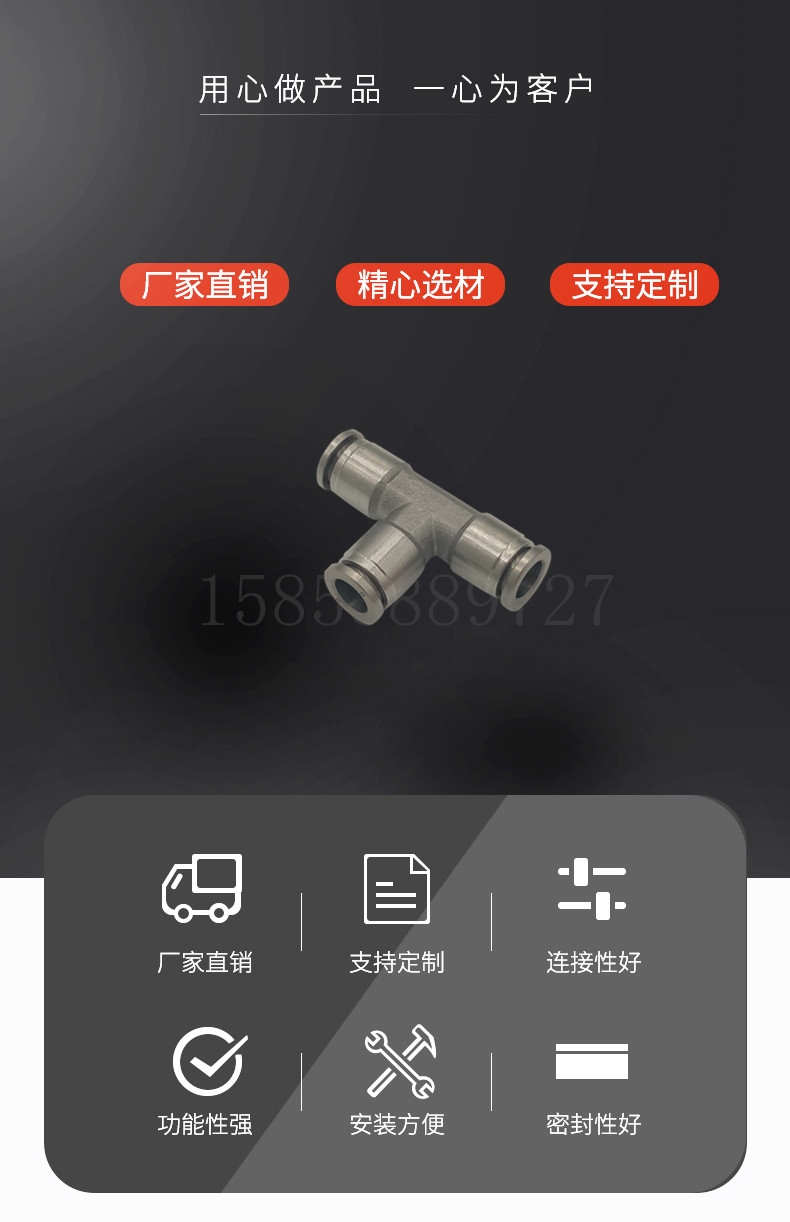 不锈钢T型快插异径三通相容性:可搭配尼龙管、PU管、特氟龙管使用,适应性水气环系统、工作母机、车床等。