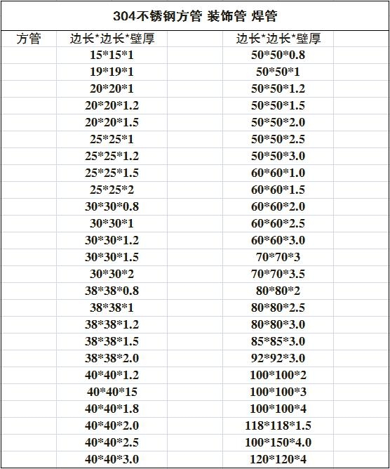2.不锈钢矩形管 不锈钢扁管:□10x20□10x30□10x40□10x50□10x60□11x23□12x24□12.7x22□13x25□13x28□15x30□16x32□20x40□22x34□23x36□23x48□25x38□25x50□25x75□30x60□30x70□40x60□40x80□40x100□43x73□45x75□45x95□50x100.60*120 60*80 100*120 100*150 100*2003.不锈钢方管: