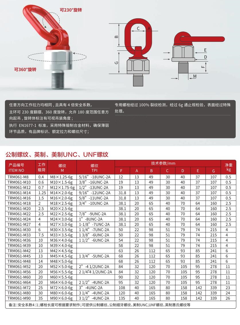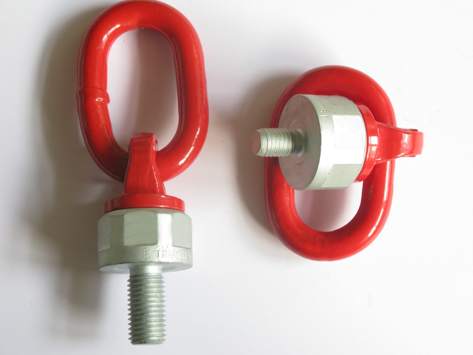 TRM061旋转吊环是合金钢材质经高温热处理出来的用于机械吊装产品,旋转吊环可以360度旋转,180度范围内任意翻转,安全系数4:1。广泛应用于海上,电力,造船,物流搬运、机械吊装等领域,以提高搬运吊装的工作效率。节省了人力物力。