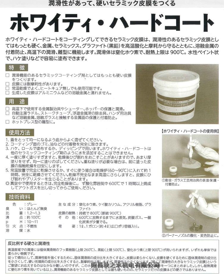 窒化ほう素と黒鉛を潤滑体に、溶媒には水と少量のアルコールを使用。有機系と無機系のバインダーを添加した製品です。常温乾燥で、潤滑機能のあるセラミックで最も硬い、グレー色の丈夫な皮膜を形成します。水添加により粘度の調整が可能です。 【容量:1?、1????】 |