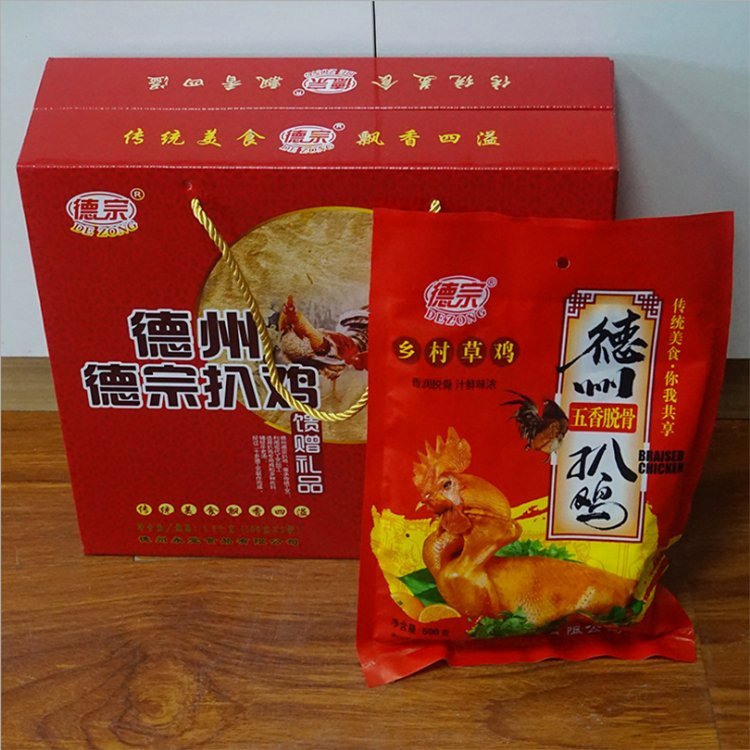 ???据《禹城县志》记载,制作扒鸡早的禹城城北月牙湾村民王明奎,其祖辈皆以煮鸡为生。他家把杀好的鸡将两腿交叉别入膛内,把两翅膀从鸡脖的刀口插入,让翅尖从嘴的两侧伸出,然后放上常用的佐料,曰"扒鸡"。后来为招揽生意,他请一名老中医开了丁香、桂皮、花椒、大料、小茴香等5味调味品,煮出的扒鸡、大开胃口,那时叫作"五香扒鸡"。王明奎18岁那年(清光绪十七年,即公元1891年)秋季的一天傍晚,他把20多只鸡煮在锅里,灶中多加劈柴,燃起火就去歇息,由于劳累,醒来时天已大亮、炖时大过,锅里的鸡塌了下去、一提鸡腿、骨肉分离。他哭笑不得只好用铁笊篱小心地把鸡捞到篮子里提到县城去卖,并将煮烂的鸡取名叫"五香脱骨扒鸡"。在县衙门口叫喊了几声后,"脱骨"二字便引起众人注意,霎时间招来了许多食客。从此他家煮鸡都长时间炖煮,直至脱骨,形成了独特的制作工艺。因此禹城五香脱骨扒鸡便名声大振、南北。于次年初(1892年)在德州办起了以经营脱骨扒鸡为主的小饭庄,从此禹城五香脱骨扒鸡便传入德州。另外王明奎有个儿子叫王吉三,爷俩凭着一手高超的技术,先后在禹城火车站、德州、济南、沾化、利津等地开设了扒鸡铺,禹城五香脱骨扒鸡的名声也越来越大。