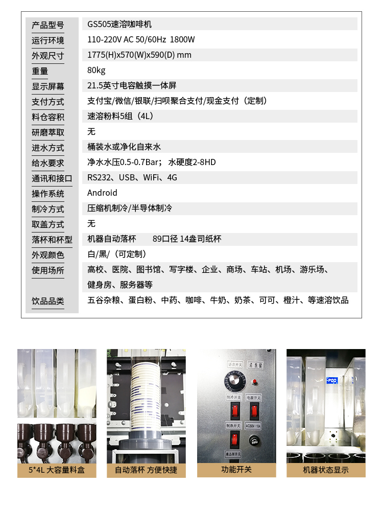 操作方式 | 自助点单 扫码支付 自动落杯出饮 | ||