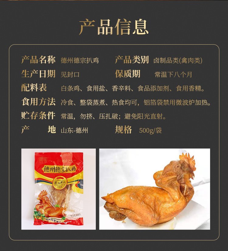 德州德宗扒鸡采用真空包装,开袋即食就可以,也可以使用微波炉稍微加热一下或用锅蒸一下,出锅之后的扒鸡热乎乎、油嘟嘟、香喷喷,再配上啤酒更是相得益彰!??
