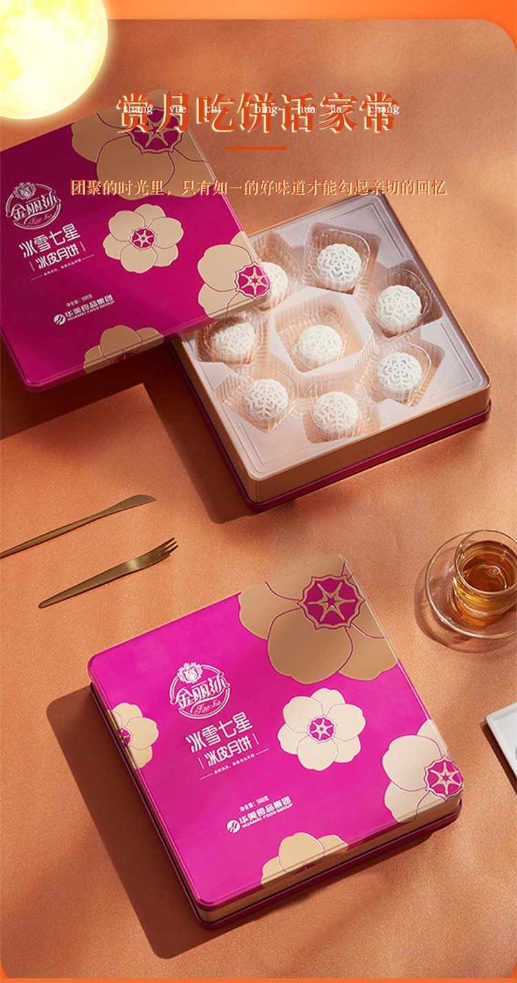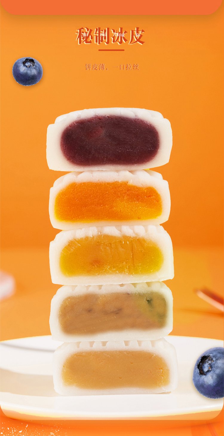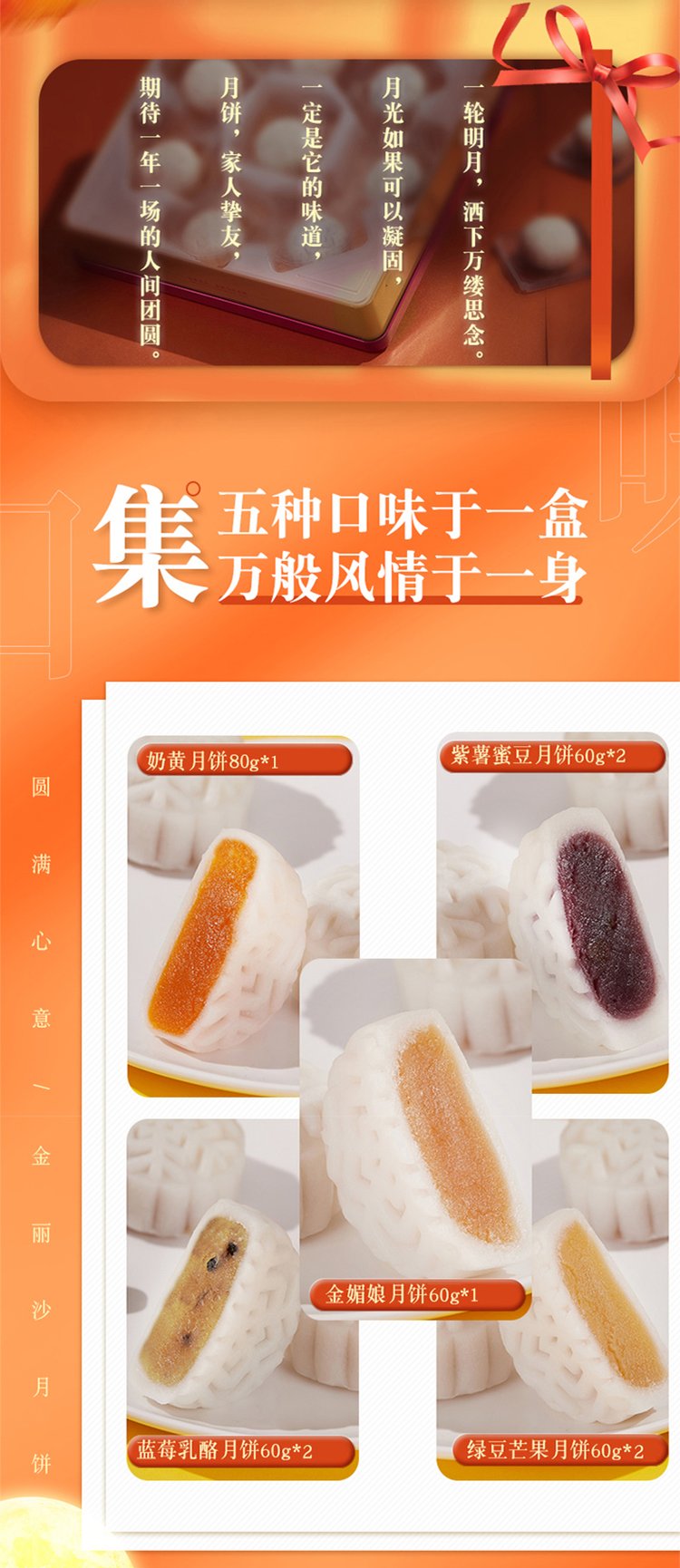 内配规格 | 80克奶黄月饼1个 60克金媚娘月饼1个 60克蓝莓乳酪月饼2个 60克绿豆芒果月饼2个 60克紫薯蜜豆月饼2个 | ||
