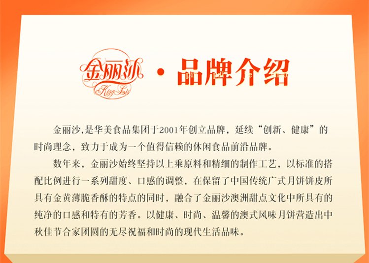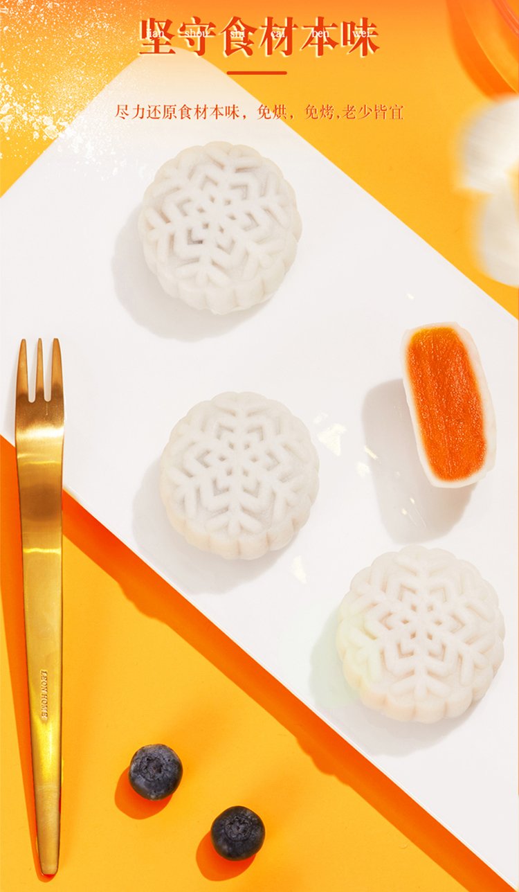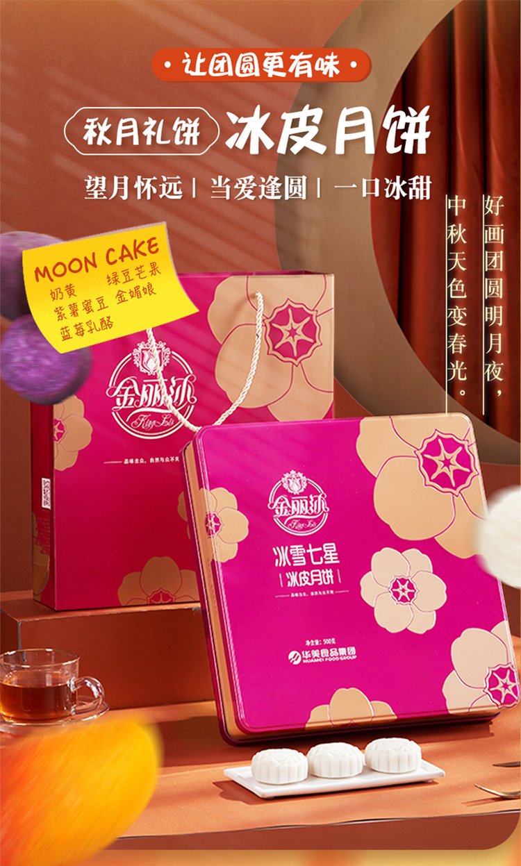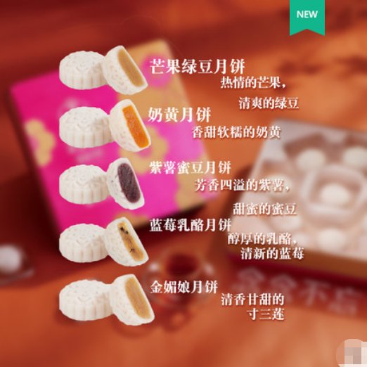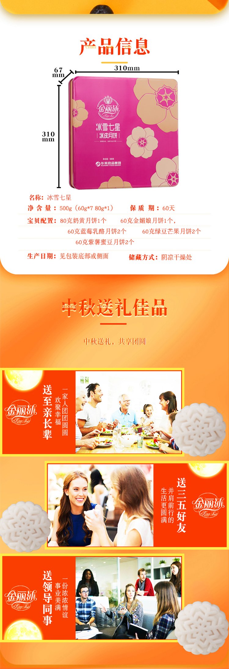 内配规格 | 80克奶黄月饼1个 60克金媚娘月饼1个 60克蓝莓乳酪月饼2个 60克绿豆芒果月饼2个 60克紫薯蜜豆月饼2个 | ||
