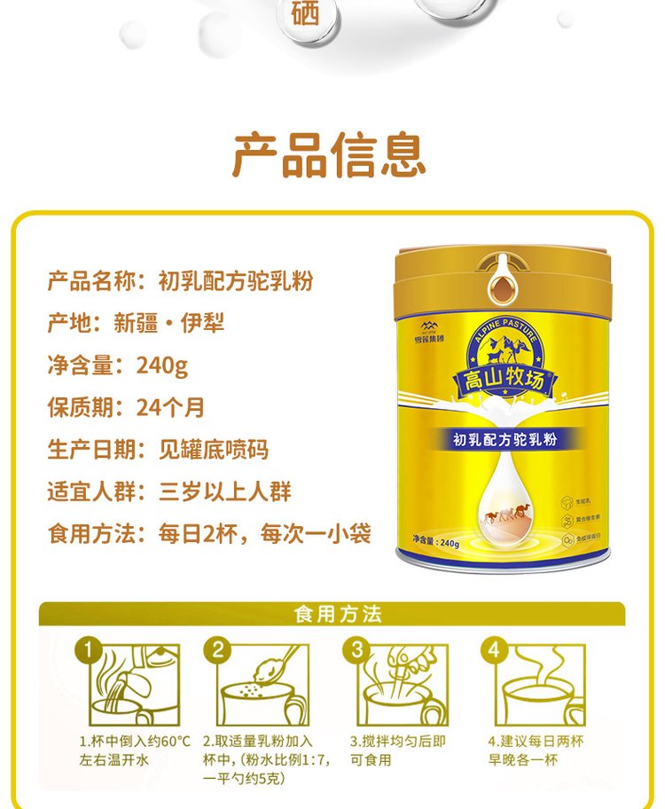 初乳配方成人驼奶粉乳粉高钙儿童中老年可用240g装高山牧场