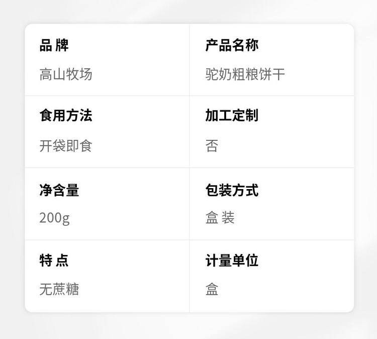产品名称 | 驼奶粗粮饼干 | ||