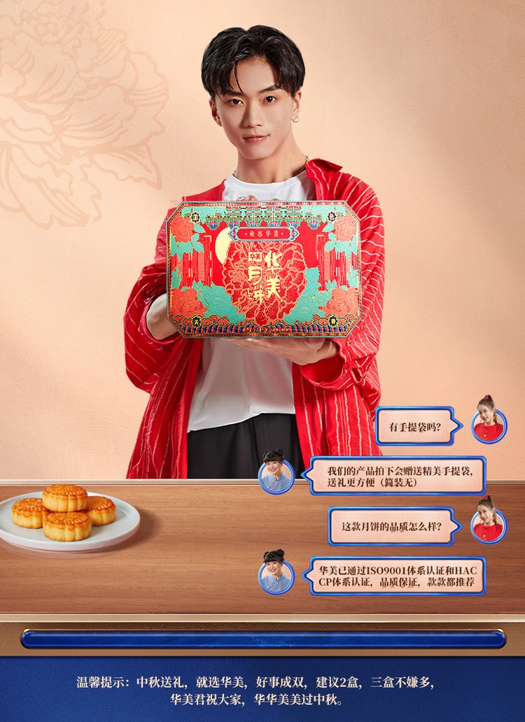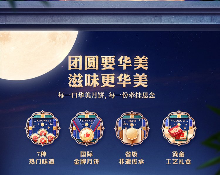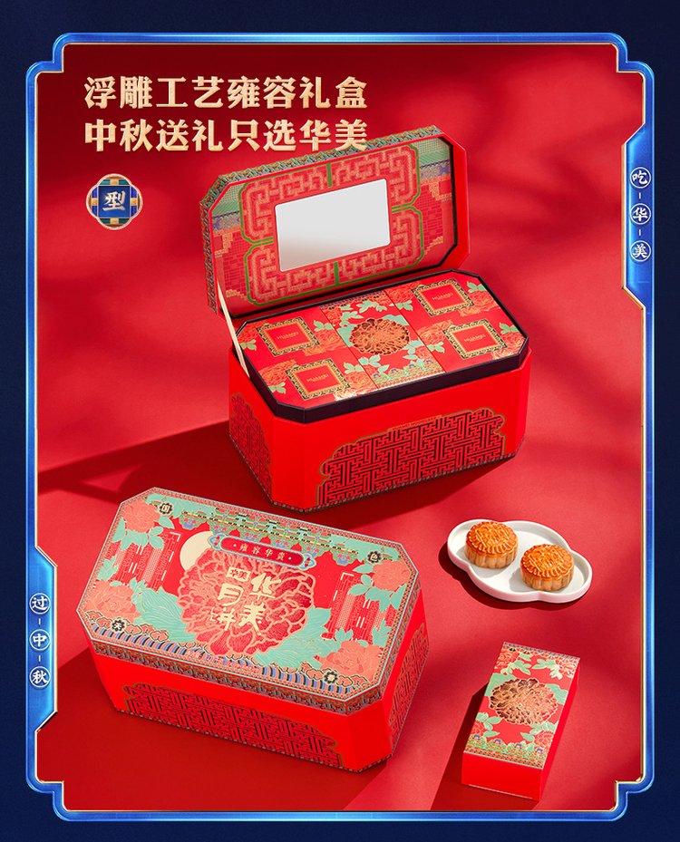 内配规格 | 蛋黄纯白莲蓉月饼 125克*1 玫瑰荔枝月饼 50克*3 牡丹花味月饼 125克*1 红豆蓉月饼 50克*3 金丝枣蓉月饼 80克*2 松茸爆牛肉月饼 50克*3 燕窝流心奶黄月饼 50克*3 | ||