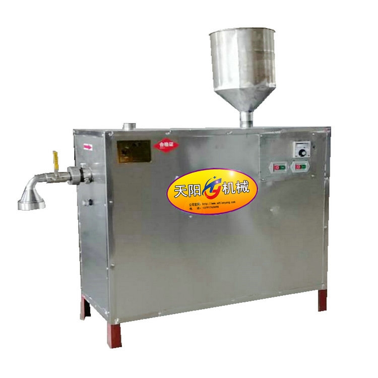 肠粉(卷粉,烫皮,米皮,河粉)是以晚稻米磨成的米浆为原料做成粉片,米粉片撒上木耳,猪肉等馅料,再卷成的圆筒状的食物,卷粉皮白如雪花、薄如蝉翼、晶莹剔透,皮软而不烂,有韧劲。馅料爽口有嚼劲,配以特制辣椒酱蘸料,辣中带着微微的甜味,十足的美味,是人们喜爱的早餐食品。天阳肠粉机(米皮机凉皮机东北大拉皮机粉带机卷粉机)由电热水浴蒸煮箱、智能温控装置、螺旋推进装置和成型模头组成,结构紧凑,体积小、重量轻、性能稳定,使用电源,一机多用,投资少,见效快,是家庭、个体、开门市店理想的食品机械。天阳肠粉机采用电热水煮自动控温装置,避免了传统熬浆易糊锅的缺点,操作简便,只需将米浆倒入机器,即可生产出薄筋光亮、滑溜爽口、民间风味的卷粉。天阳卷粉机具有以下优点:1、加热部件可常用不坏并加热快,每小时可节省1度电。2、采用仪表控温装置,抛弃经验控温的笨方法,人人均可操作。3、功能多:还可凉皮、东北大拉皮、凉粉、米豆腐、年糕、酸浆米线、玉米叉子、粉条粉丝等产品,天阳肠粉机 6FT-60型占地:2平方,人工:2人,适用动力2.2KW(220V),产量50公斤/小时,外型尺寸: 120*48*115cm,重量65公斤,价格:普通型3600元/台,不锈钢型5800元。6FT140B型,占地:2平方,人工:2人,适用动力7.5KW,产量180-200公斤/小时,重量120公斤,外型尺寸140*48*125cm,价格普通型4176元/台,不锈钢型6500元。备注:1、以上机器价格不含动力和运费。2、机器保修两年。