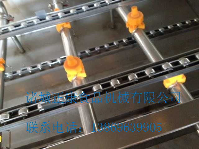 2.设备原理需清洗的周转筐由不锈钢链条输入清洗机中,依次通过加温老碱水→高压热水→常温自来水→消毒水→常温风刀去水等多道工序,将筐子清洗干净,同时完成杀菌及风干;特殊筐子清洗时可在热碱水清洗段后加配毛刷,对筐子底部及左右两侧进行刷洗,提高清洗效果;采用连续式清洗,以提高清洗效率;