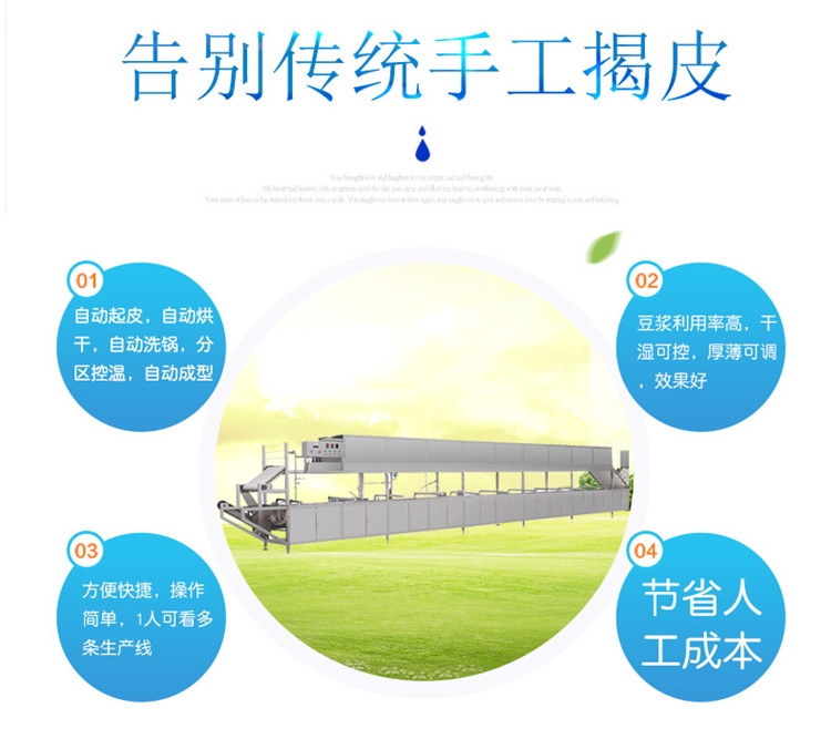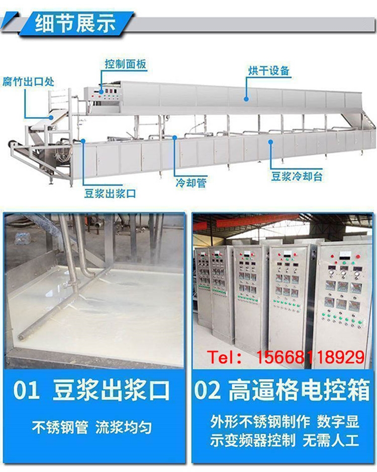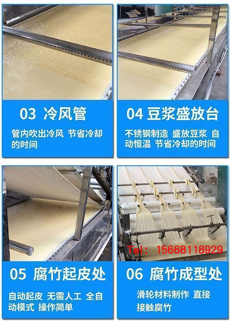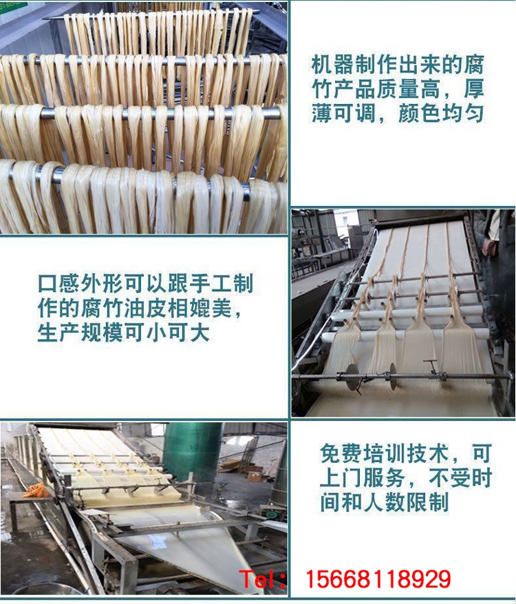 厂家直销「全自动腐竹机」大型自动揭皮烘干豆油皮机 腐竹加工厂投资项目——中科圣创全自动腐竹机结合传统手工揭皮生产工艺,机械化代替手工化,生产环境干净卫生,减少用工人数,提高腐竹生产产量与质量,全自动腐竹机受广大生产者与消费者好评,干净,卫生,先进,是您做腐竹油皮的选择。中科圣创全自动腐竹机代替传统腐竹油皮设备实行自动化运行,自动下浆,自动起皮,自动定型,自动烘烤,自动回潮,自动切割,大小尺寸自动调试,系统采用调频与数控控制。