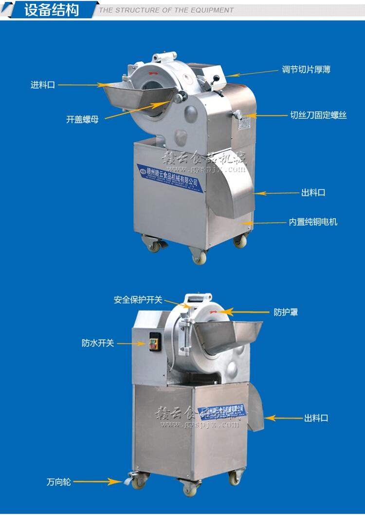 这种专业的果蔬切丁机的特点就是切丁一次成型,操作简单,只要启动机器把物料丢进机器里,就直接切出来一颗颗的颗粒,我们手工切土豆丁的时候首先要切成土豆片,然后把土豆片切成土豆条,再把土豆条切成土豆丁,也需要分开切3次才能切成土豆丁。那机器是如何一次性就快速切成土豆丁的呢。我们先通过图片来了解一下赣云牌果蔬切丁机的构造: