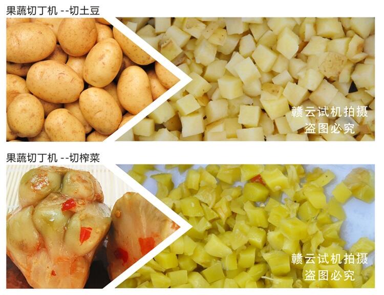 切土豆丁萝卜丁的机器内部分别设置有切片刀、切条刀、切丁刀。把土豆切成土豆片之后马上经过切条到切成条,切好的土豆条再经过切丁刀快速切成土豆丁,这就是果蔬切丁机切丁能够一次成型的原因,切出来的果蔬丁果蔬颗粒不仅速度快而且切的非常漂亮。这款机器的用于也是非常广泛的,圆球型的蔬菜都可以用这个机器切成颗粒。