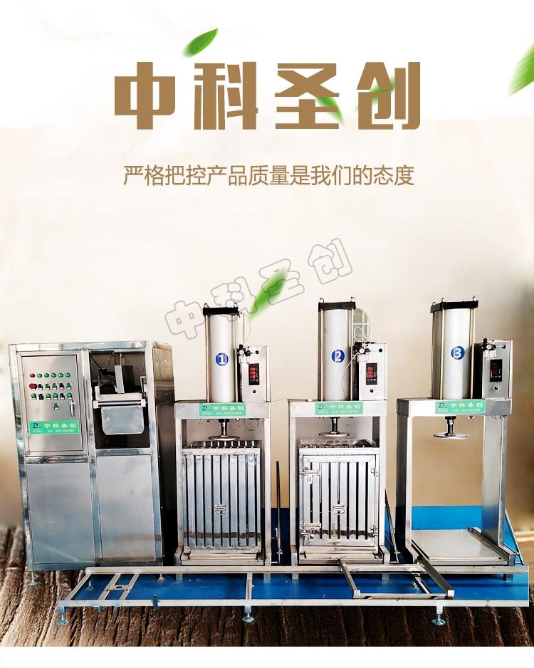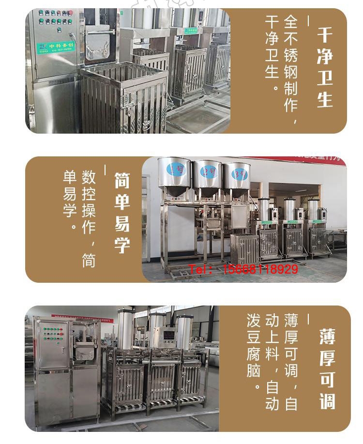 全自动豆腐干机,自动泼脑压榨豆腐干机器,小型豆腐干生产线厂家直销——中科圣创全自动豆腐干机采用微电脑控制,机器自动上脑、自动泼脑,方便快捷,根据地区不同,调节薄厚程度和压制时间,生产多种产品,比如豆腐干,牛筋干,熏豆干等等。数控豆干机占地小,产量高,一小时可加工100-200斤豆子,压箱底下有升降机,自动升降,在舒适的高度轻松做豆干。豆干泼好后有导轨推到压机上,压机采用气压机,干净卫生,压制均匀,厂内机器型号齐全,可根据产量选择合适的机器。