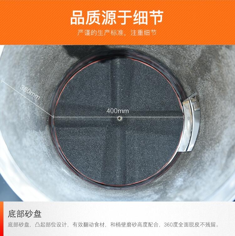 这款不锈钢清洗脱皮机,外壳采用不锈钢制造,内桶则是金刚砂制造,以前普通款的脱皮机内部是水泥的,这种金刚砂的摩擦力度大,清洗去皮效果更好,不用加木屑,脱皮去皮效果也是相当好的。底部配置沙盘,也可以根据客户要求配置铁盘,加工好之后,打开出料口可以自动出料,操作方便,实际生产过程中使用性能强。