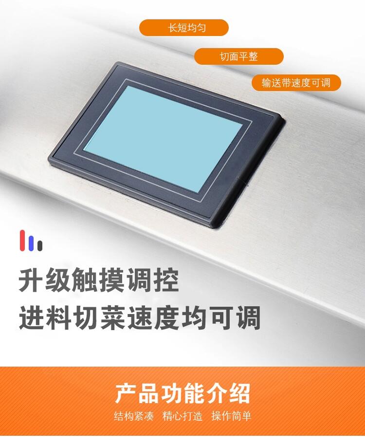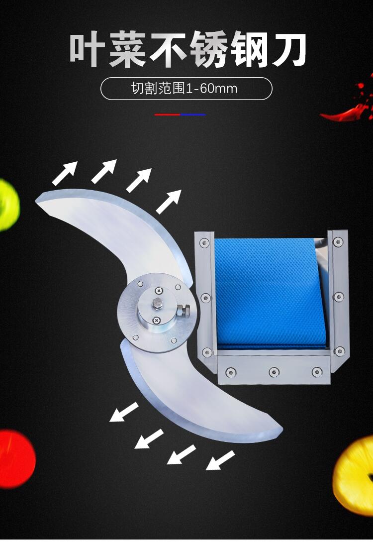 7.优势:该机械使用范围广,可用于切割多种蔬菜,比如:上海青、油麦菜、芹菜、包菜、空心菜、大白菜等叶菜;也可以用于切割长条形蔬菜,比如:茄子、豆角、西芹、大蒜、韭菜、小葱、辣椒等;本机通过数控系统切割蔬菜,通过调节输送带和切刀速度调节切割厚薄,调节方便,操作简单;本机切割厚薄调节范围广,可以切片、切丝、切刀,一天机器可以加工多种长度的蔬菜,切割厚薄均匀;输送带和切刀均设有防护罩,机器设置有开盖停机功能,操作安全;机器采用加厚304不锈钢制造,具有很好的防腐蚀防锈能力,采用先进的台湾切菜机工艺设计生产,运行稳定,故障率低;该机数控箱和电机均采用全封闭设计,清洗过程可直接用水冲洗,清洗方便,即使在潮湿的环境,电机和电控箱都能较好的保持干燥的环境,电器使用寿命长。