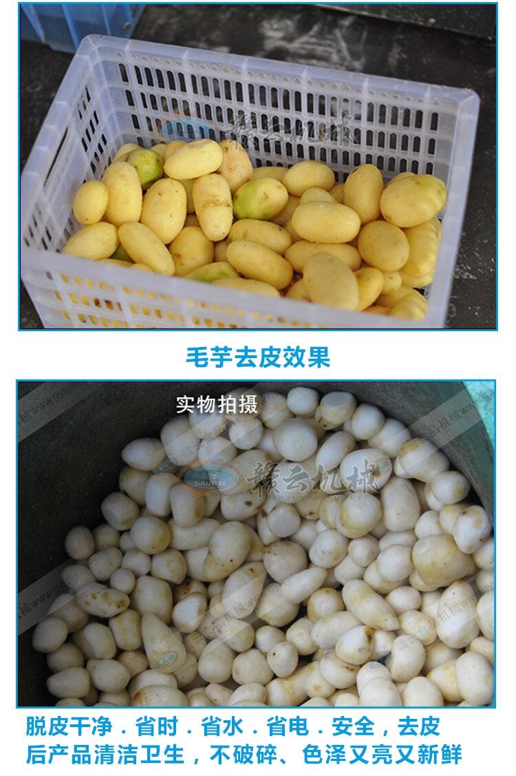 功能:该机械采用离心转动方式通过跟圆筒内壁摩擦达到去皮目的,适用于毛芋、土豆去皮,一桶毛芋仅需5分钟即可脱皮完成