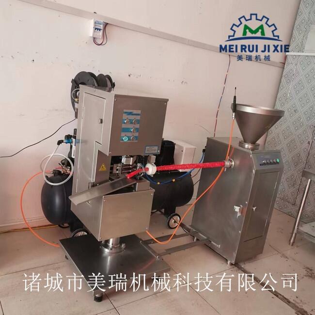 香肠灌肠机 小型火腿肠全套生产灌肠设备价格该机使用敞开式不锈钢料斗,适用于连续添加物料;采用双嘴灌装,效率高,产品质量稳定,保鲜等特点。使桶内的物料产生压力后将料挤出,适用物料范围较广,尤其对较干的料馅相对其他灌肠机效果更佳设备整体结构合理、适用于灌制各种香肠、红肠、腊肠及糊状物制品。随时更换灌装咀改变产品规格。调准工作压力后在液压缸的作用下,同时该机具有不破坏物料成份,保质、