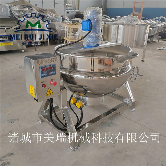 美瑞生产电加热加层锅 燃气导热油夹层锅 300L卤煮夹层锅但是常规的夹层锅一般都是带有搅拌齿的,所以蒸煮锅也是属于夹层锅的一种,二者的区别在于是否带搅拌装置,可以做上自动出料的箅子,带上盖子,一般蒸煮锅是不带搅拌的,可以用于多种产品的加工使用的,如果是炒制酱类、炒菜、凉粉、米豆腐等,蒸煮炒制熬制等等的一系列的操作都是适合的,两种锅适合加工的产品不一样,可根据选择的加热方式的不同的煮锅来实现不同的温度的加工的,一种是蒸煮、一种是炒制,