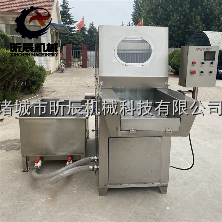 诸城昕辰机械专业生产各种肉类食品机械,盐水注射机是肉食加工的常用设备。盐水注射机可以将盐水及辅料配置的腌制液注入肉块当中,在通过真空滚揉机使料液充分盐渍,渗透,可疏松肌肉组织结构,有利于肌球蛋白溶出,并且由于添加剂对原料肉离子强度作用和蛋白等特点的调整作用,注入配制的水溶液能使肉质嫩化、松软、从而提高了肉制品的出品率和改善肉制品的嫩度和口感。