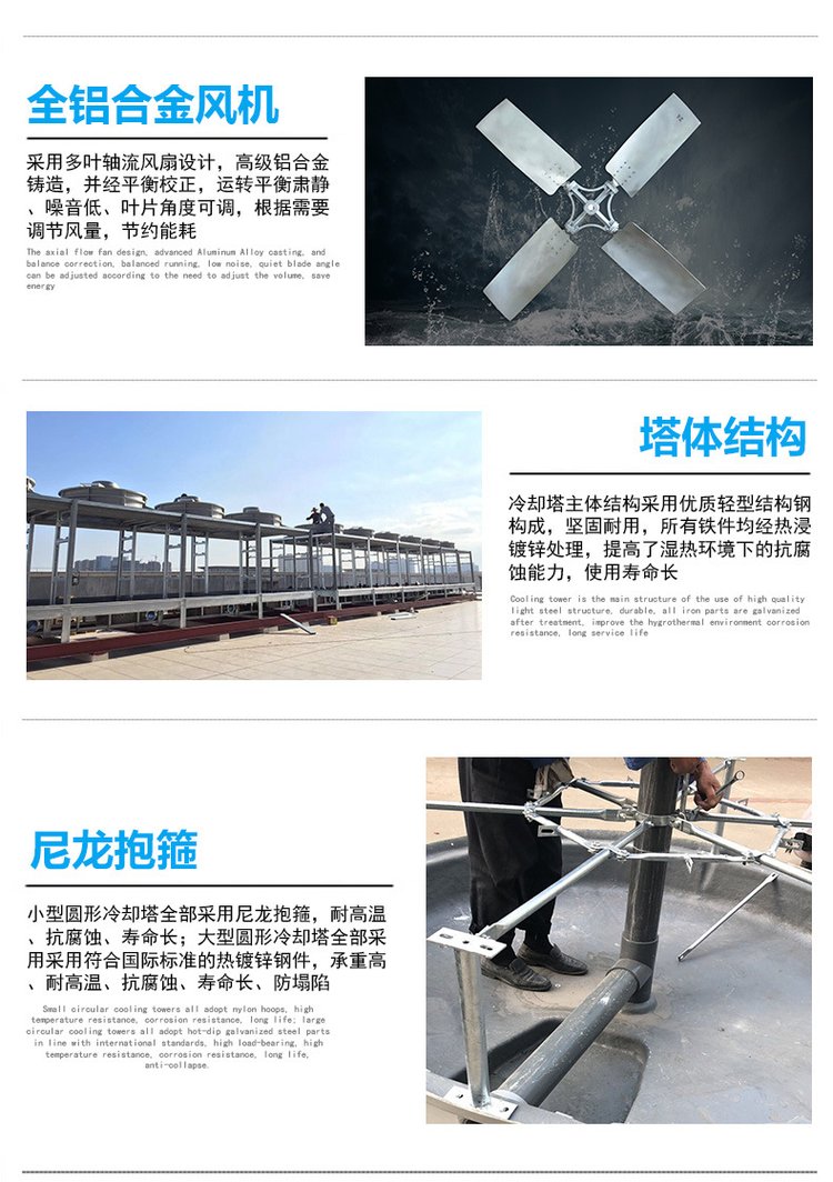 上海反应炉配套用方形逆流凉水塔 玻璃钢凉水塔 户外防水型电机 铝合金机翼型风叶 热镀锌钢支架方形逆流凉水塔简介:
