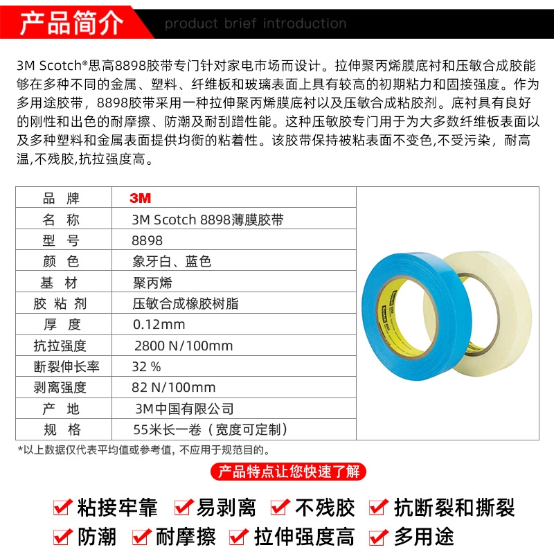 3M8898蓝色打印机冰箱家电固定胶带8898白强力高粘撕下无痕单面胶