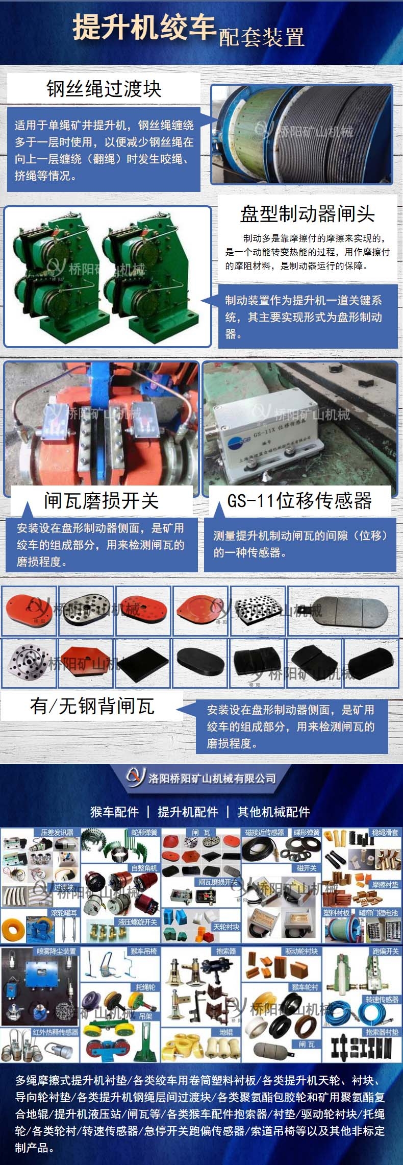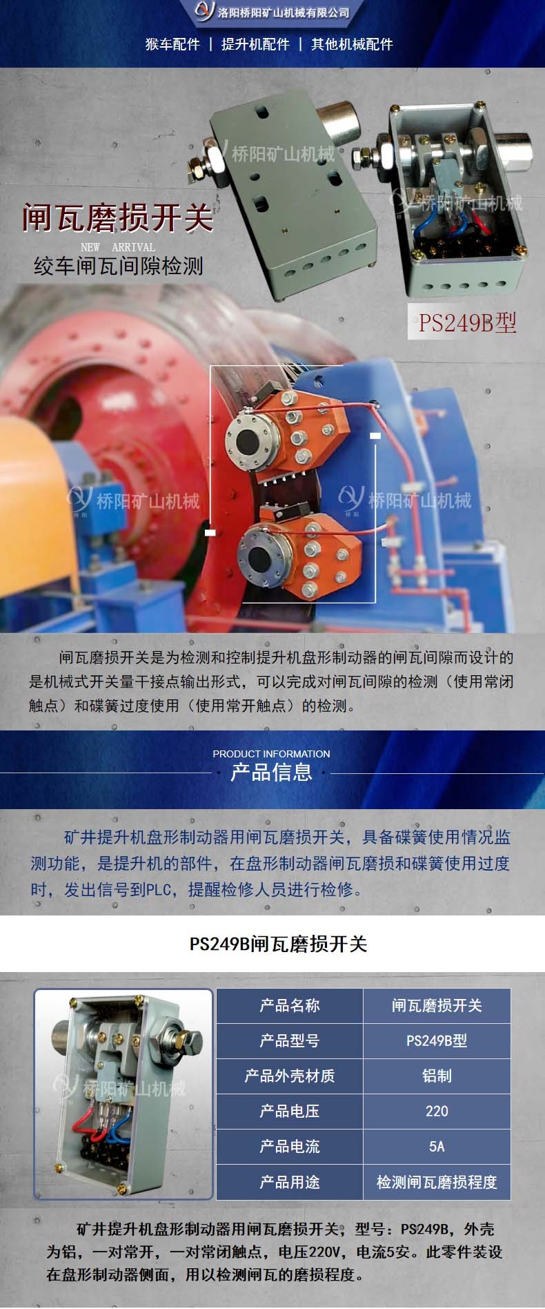 洛阳桥阳矿山机械有限公司主要经营猴车配件、提升机配件以及其他机械配件。其中型号为PS249B的闸瓦磨损开关是主营之一,它根据客户要求可以选择采用的材质是铝或者是树脂。其电压为220V,电流5安,产品别名矿井提升机盘形制动器用闸瓦磨损开关,此配件安装设在盘形制动器侧面,是矿用绞车的组成部分,用来检测闸瓦的磨损程度,绞车的运行。