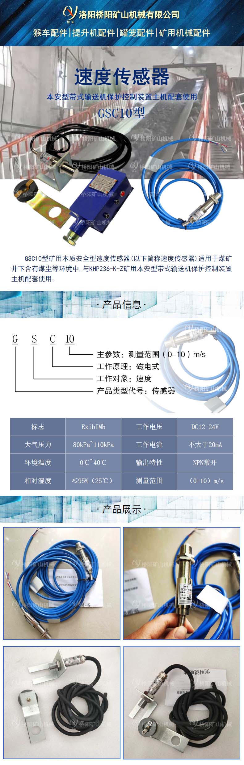 GSC10矿用本质安全型速度传感器(以下简称速度传感器)适用于煤矿井下环境中,与KHF236-K-Z矿用隔bao兼本安型带式输送机保护控制装置主机(以下简称主机)配套使用。接入本质安全型系统信号装置中,作为胶带输送机的胶带速度检测、低速打滑、断带故障保护用,使胶带输送机发出低速打滑、断带故障信号而使系统断电停机,也可用于地面非防bao等有胶带输送机的场合。