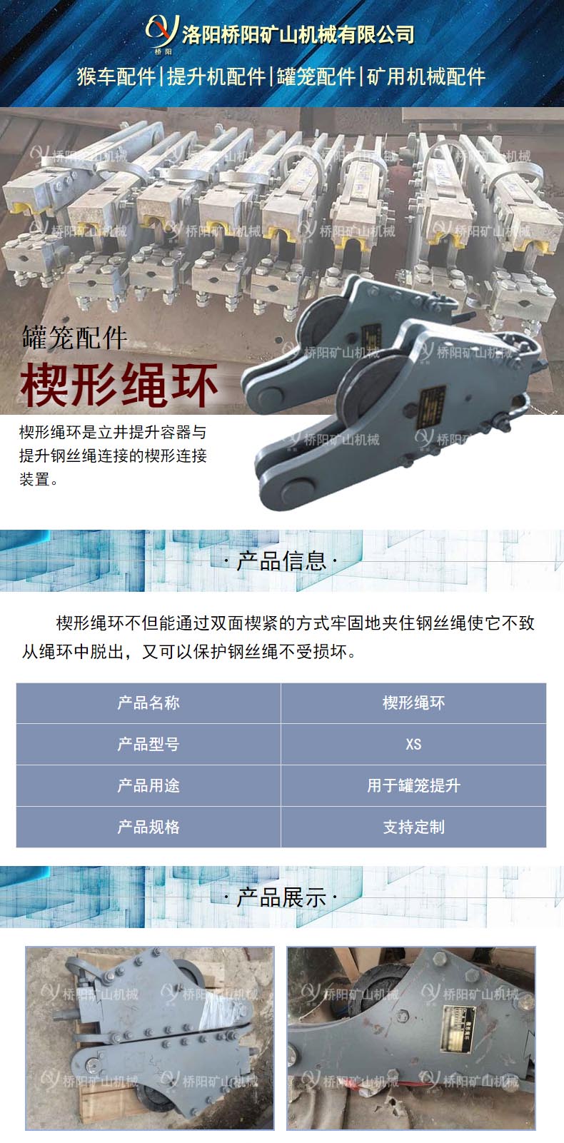 楔形绳环是立井提升容器与提升钢丝绳连接的楔形连接装置,它不但能通过双面楔紧的方式牢固地夹住钢丝绳使它不致从绳环中脱出,又可以保护钢丝绳不受损坏。