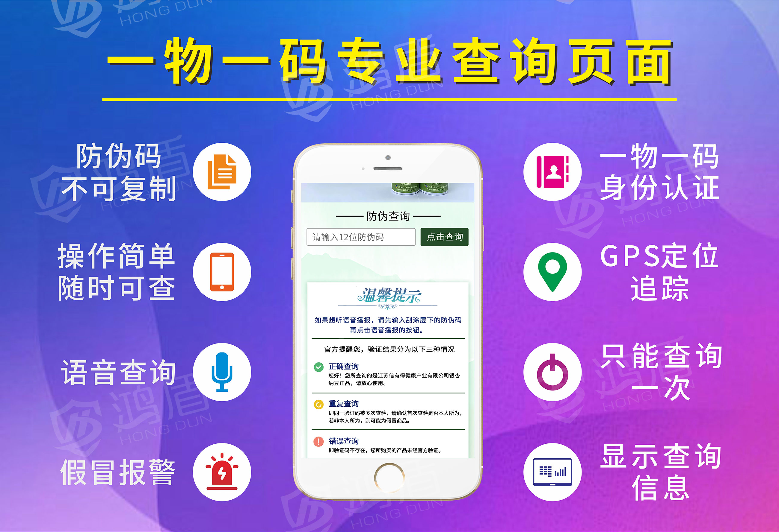 功能 | 防伪,溯源,红包营销,防窜货追溯,电子质保,其他定制功能 | ||